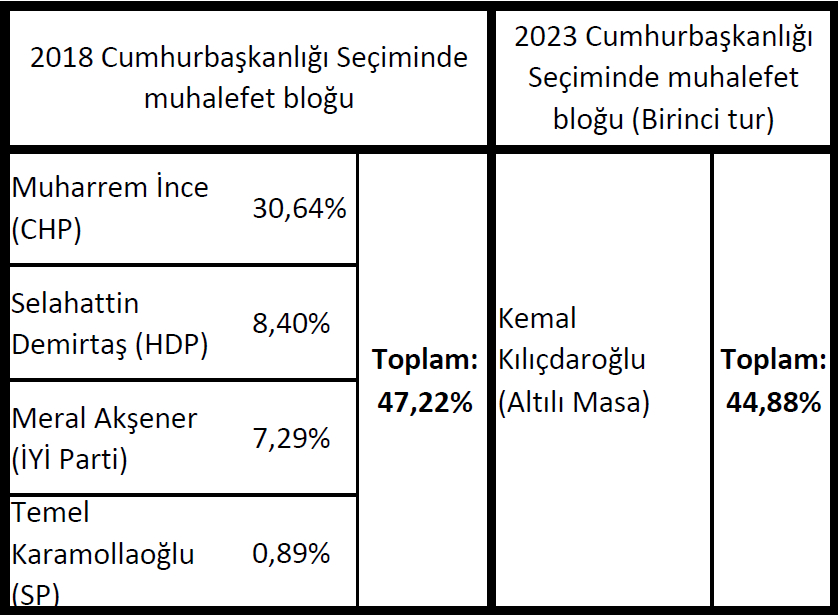 Ayrıca 2018 Cumhurbaşkanlığı seçimleri sonuçlarıyla da karşılaştırdığımızda, Kılıçdaroğlu’nun Altılı Masa stratejisinin verdiği zarar daha net görülebilir. 2018’de Muharrem İnce %30,64 oy almıştı. Akşener’in %7,3, Demirtaş’ın %8,4, Karamollaoğlu’nun ise %0,9 oyu vardı. Tümünün oyları toplandığında, 2018’de %48’e ulaşan bir oy bloğu söz konusudur. Son seçimde ise Kılıçdaroğlu %44,9 oy almıştır. Yani muhalefet açısından yaklaşık 3 puanlık bir düşüş söz konusudur. Kılıçdaroğlu’nun %45 oy almasını “başarı” olarak görenler, aslında %48’den %45’e düşüşün hesabını sormalıdır. Altılı Masa stratejisi, demek ki, Kılıçdaroğlu’nun adaylığına da zarar vermiştir.
