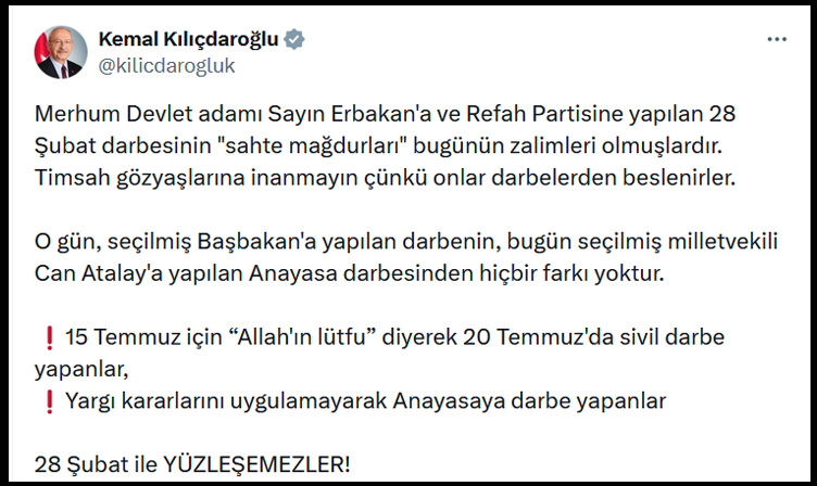 İlki, önceki gün 28 Şubat’ın yıl dönümü dolayısıyla yaptığı bir paylaşım üzerineydi. 28 Şubat’ın yıl dönümünde tweet atan Kılıçdaroğlu, “Merhum Devlet adamı Sayın Erbakan’a ve Refah Partisine yapılan 28 Şubat darbesinin” ifadeleriyle bir kez daha tepkilerin odağına yerleşti.