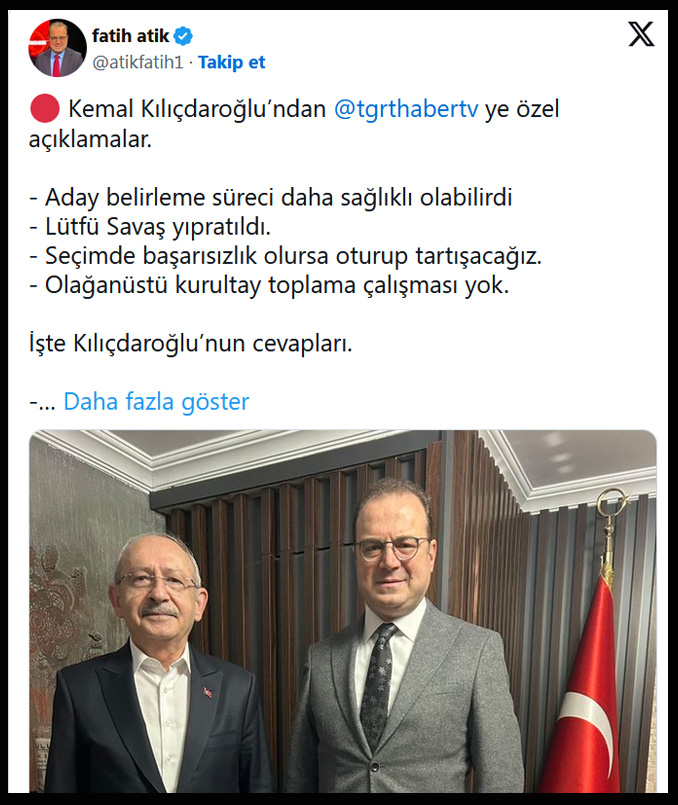 TGRT Haber’in Ankara Temsilcisi Fatih Atik’e konuşan Kılıçdaroğlu, Lütfü Savaş’ın “çok yıpratıldığını” söylemiş. Kılıçdaroğlu röportajda klasik taktiğiyle işin içinde yokmuş gibi yapıp işin içine giriveriyor.